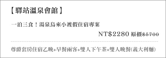 只要2,280元(雙人價)即可享有【驛站溫泉會館】原價5,700元一泊三食!湯泉烏來小渡假住宿專案:尊爵套房住宿乙晚+早餐兩客+雙人下午茶+雙人晚餐(義大利麵)?