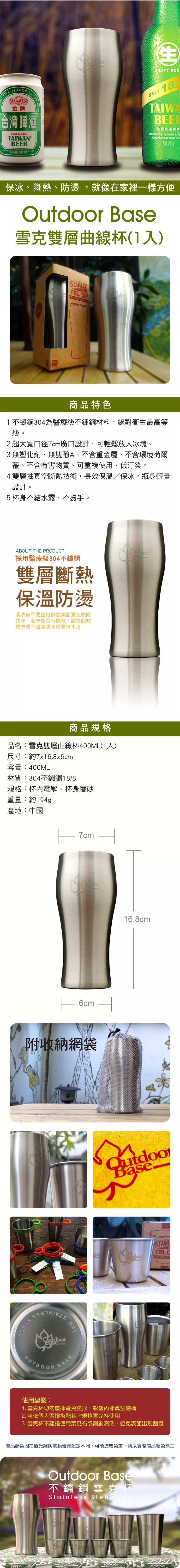 戶外餐具【Outdoorbase】雪克雙層曲線杯400ML(1入)-27531 露營餐具 野炊餐具 斷熱杯 不銹鋼杯